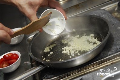 Затем добавляем черри и обжариваем, постоянно помешивая, пока помидоры не пустят сок.
