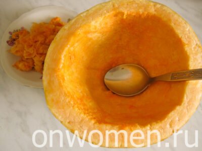 Удалите часть мякоти, но оставьте достаточно толстый слой на стенках, иначе тыква развалится при запекании.